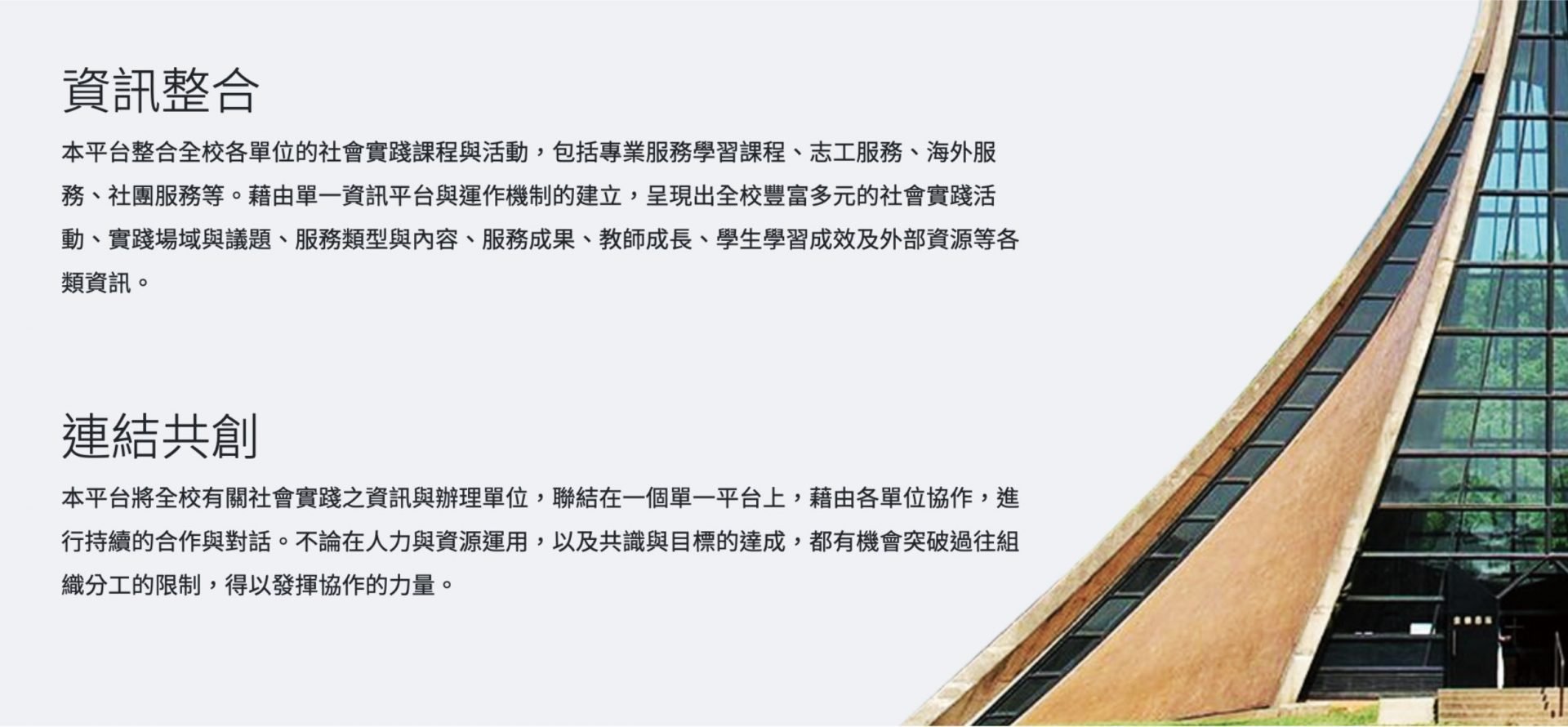 學校裡有豐富的社會實踐課程與活動資源,包含各院系的專業服務學習課程、學校裡各單位的志工服務、海外服務與社團服務等。