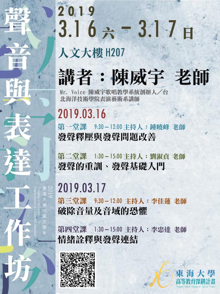 因應東海大學高教深耕計畫,中文系為子計畫1-2大一中文轉型規劃一系列活動,讓學生更加了解到高教深耕大一中文四大模組課程,緊扣溝通表模組而辦理了此次活動。中文系很榮幸邀請到Mr. Voice 陳威宇老師來帶領這次的工作坊。
