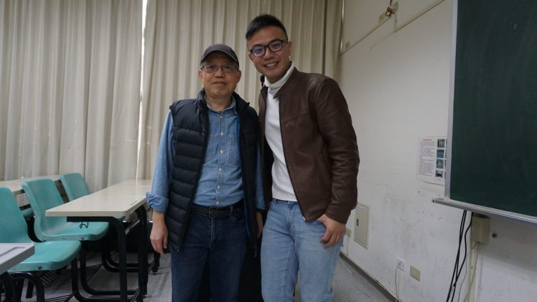 文學院深耕資深教師丘為君老師(左)與Mr. Voice陳威宇老師(右)合影